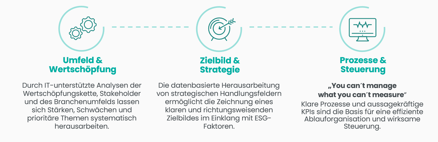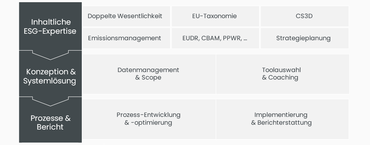Basierend auf Ihrem Status Quo erarbeiten wir mit Ihnen zusammen eine ganzheitliche und maßgeschneiderte ESG-Lösung. Dabei unterstützen wir Sie sowohl inhaltlich, konzeptuell als auch in Ihren Prozessen mit unserem Leistungsportfolio: