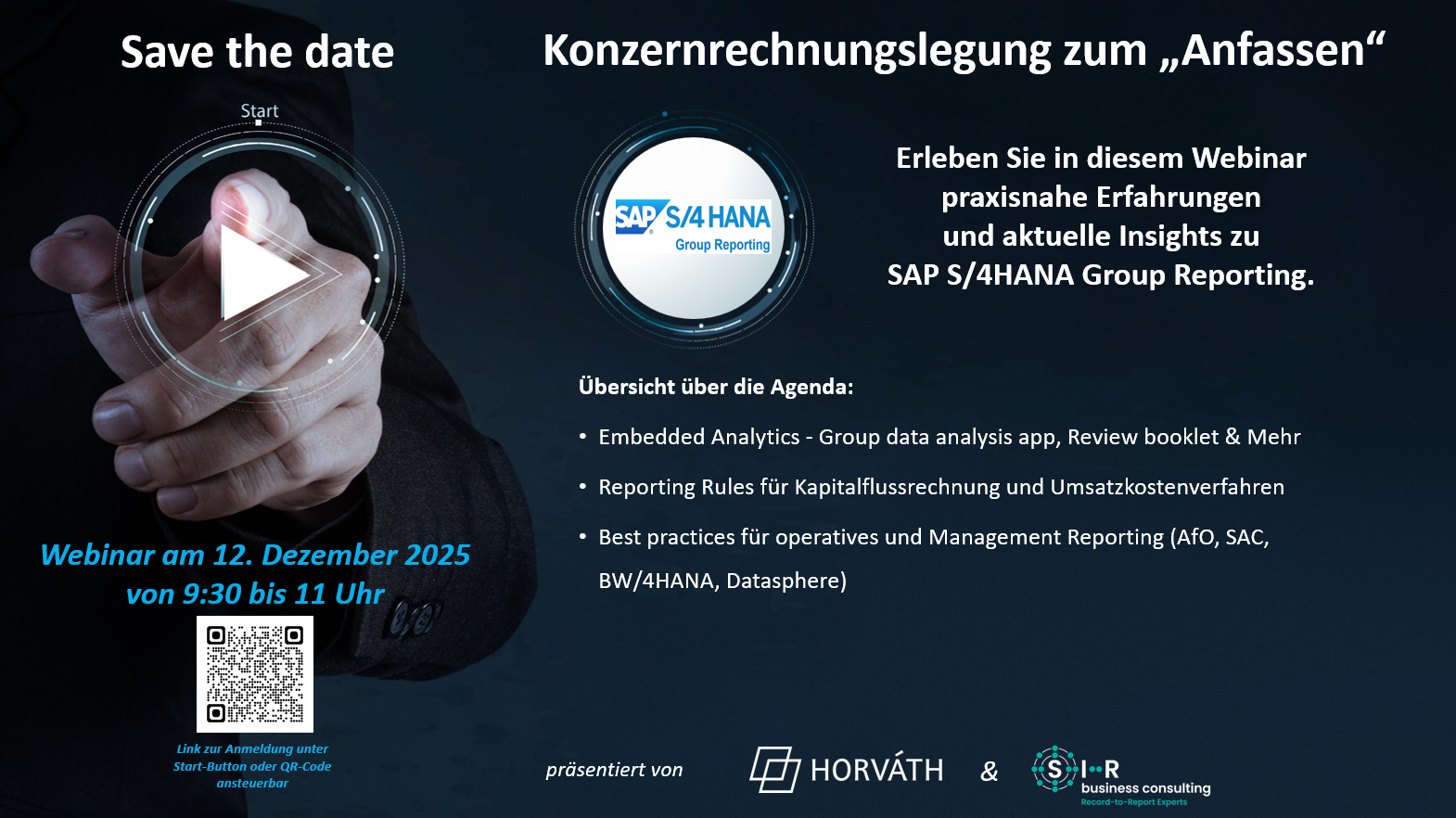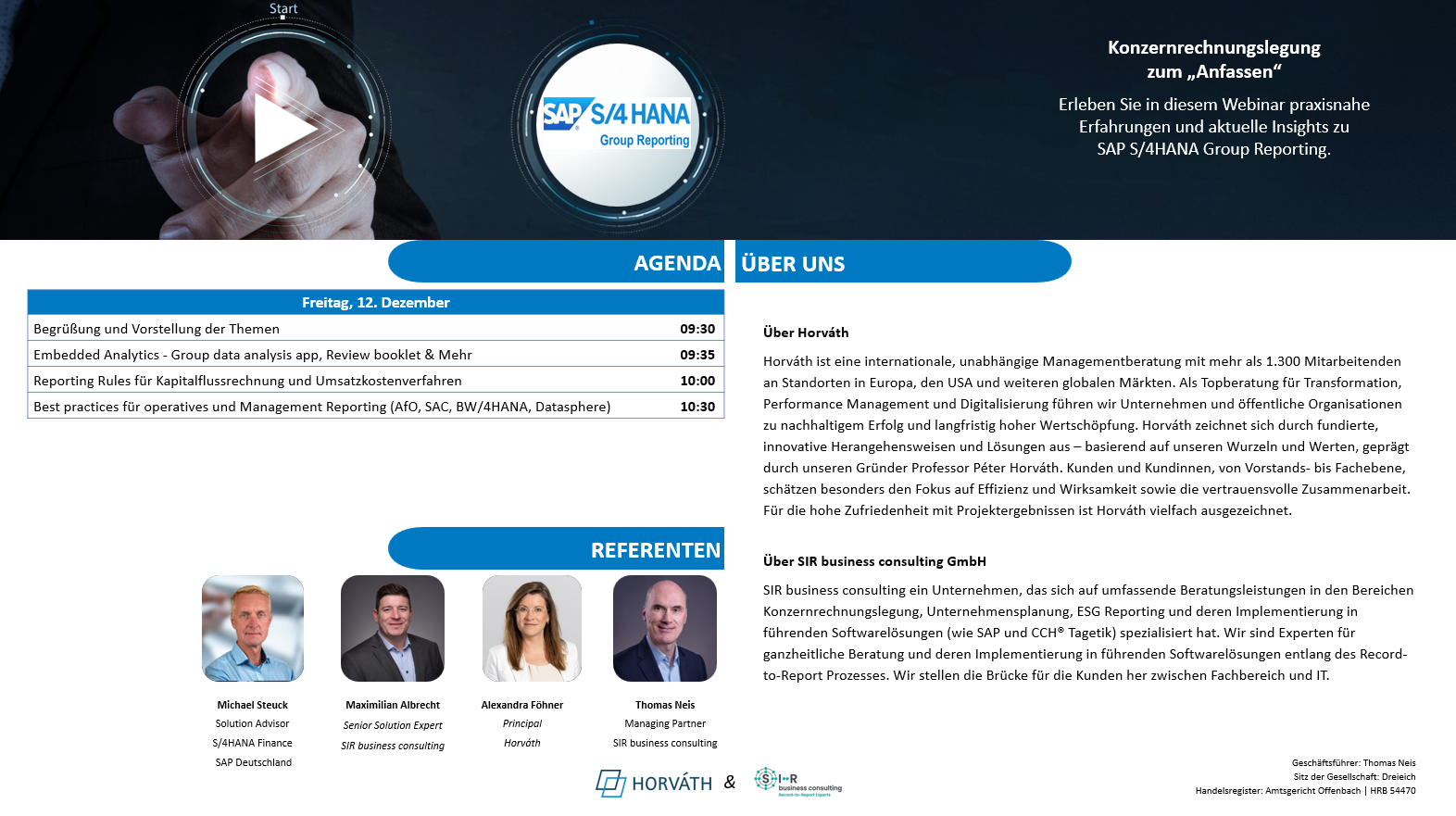 Am Freitag, den 12. Dezember 2025 zwischen 9:30 und 11.00 Uhr, referieren Herr Michael Steuck (SAP), Herr Maximilian Albrecht (SIR business consulting) und Frau Alexandra Föhner (Horvath) über über die Reporting Möglichkeiten in SAP Group Reporting: Embedded Analytics - Group data analysis app, Review booklet & Mehr, Reporting Rules für Kapitalflussrechnung und Umsatzkostenverfahren, Best practices für operatives und Management Reporting (AfO, SAC, BW/4HANA, Datasphere).